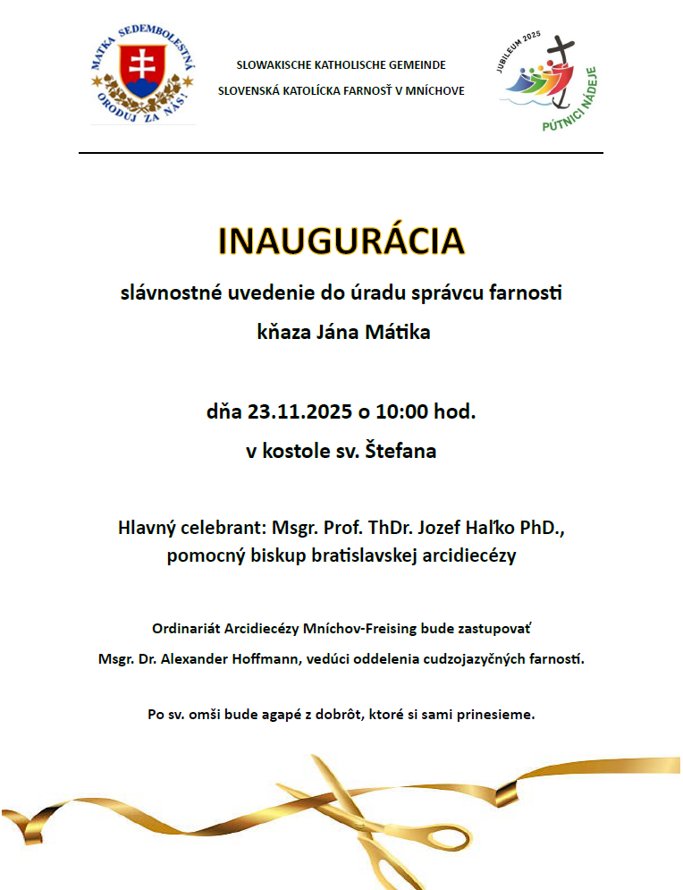 10:00 - slávnostná slovenská sv. omša - v kostole sv. Štefana v Mníchove, spojená s oslavou 50. narodenín nášho nového p. farára Ing. Mgr. Jána Mátika a jeho slávnostnou inauguráciou za správcu Slovenskej katolíckej farnosti v Mníchove.
